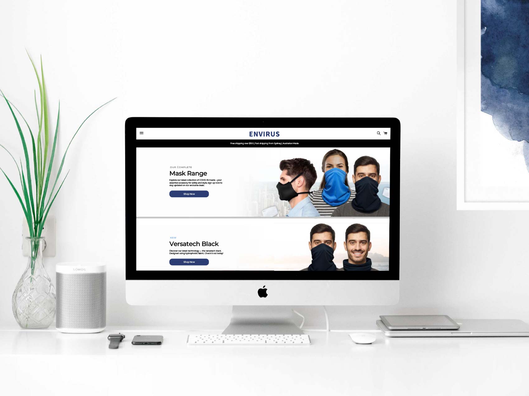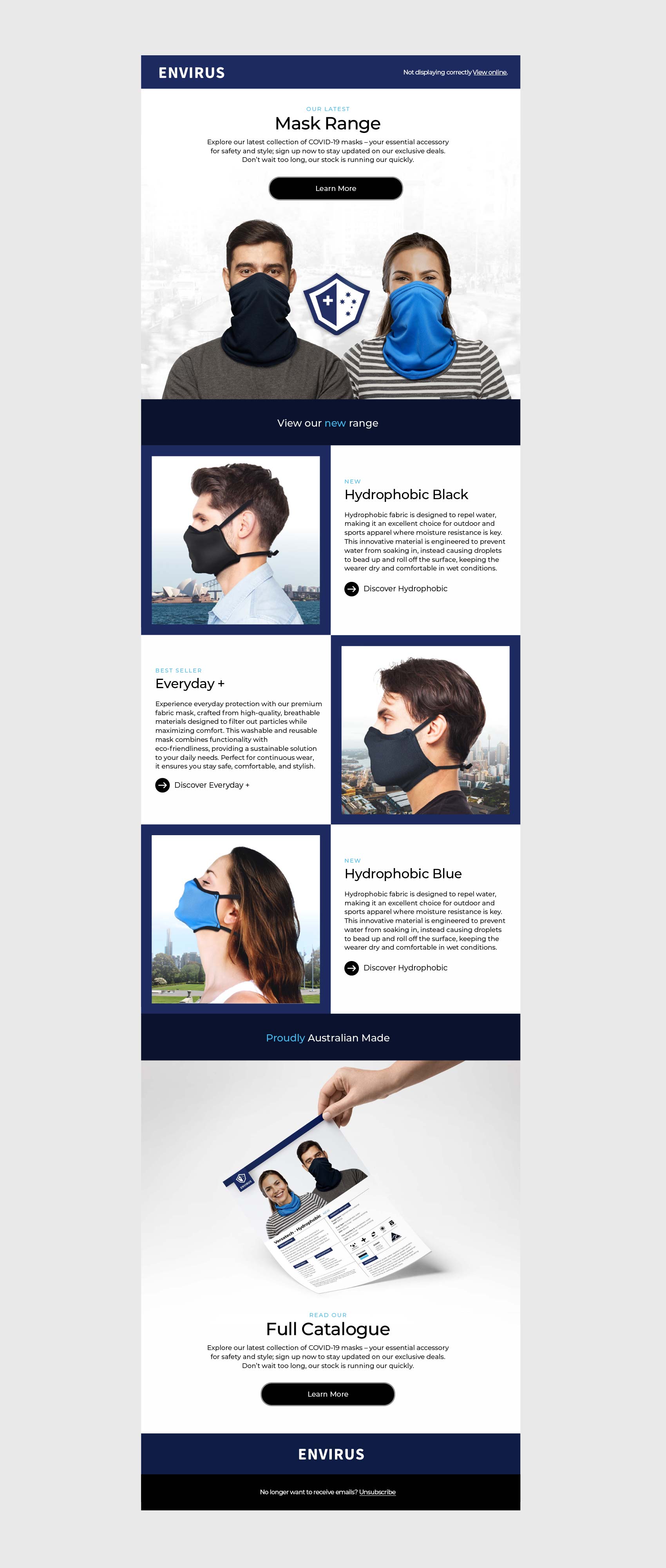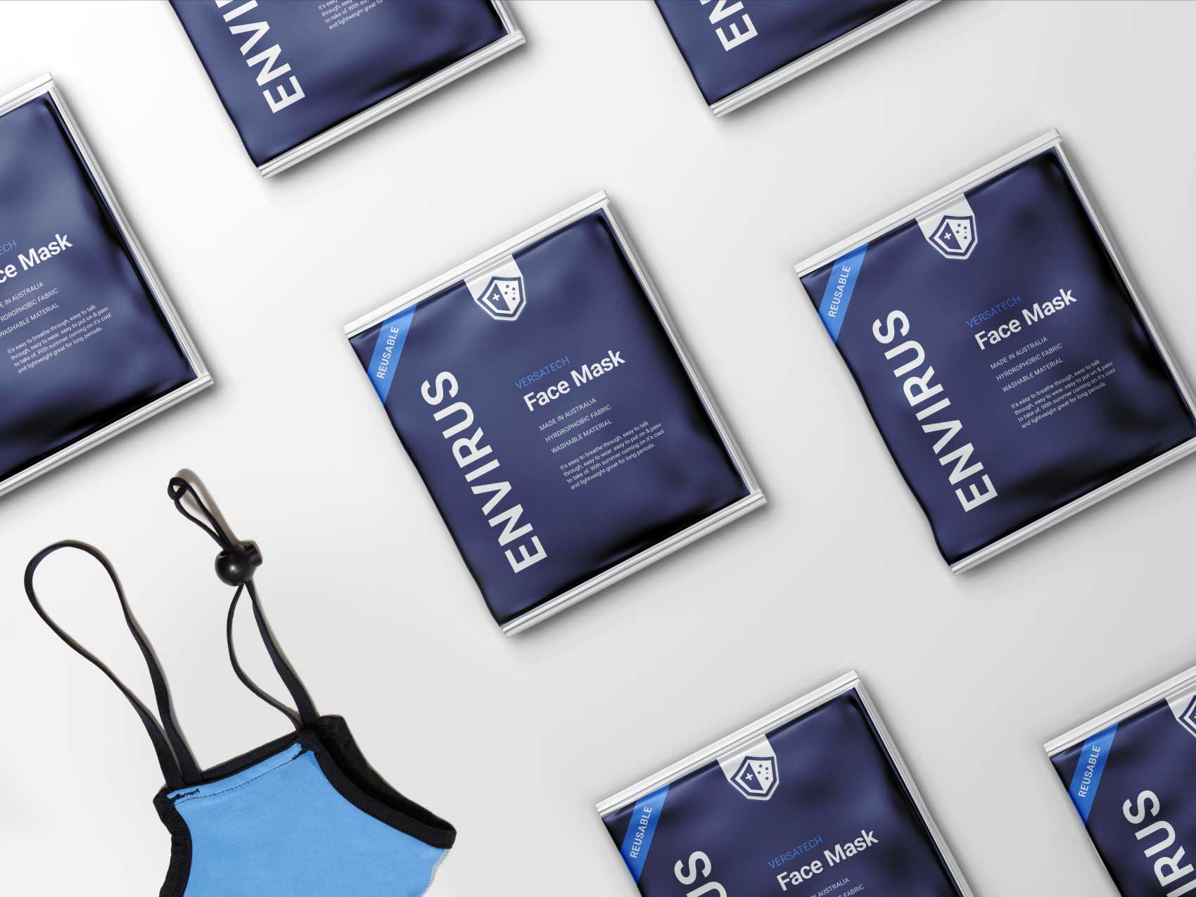 Envirus emerged during the height of COVID-19 restrictions in Australia, requiring the rapid creation of a complete brand and digital ecosystem in an extremely fast-moving market. Sam led the development of the brand identity and delivered end-to-end creative across website design and build, product design, print and packaging, digital advertising, and photography. The work was executed at speed to support immediate national demand while maintaining clarity, credibility, and trust in an Australian-made PPE product.